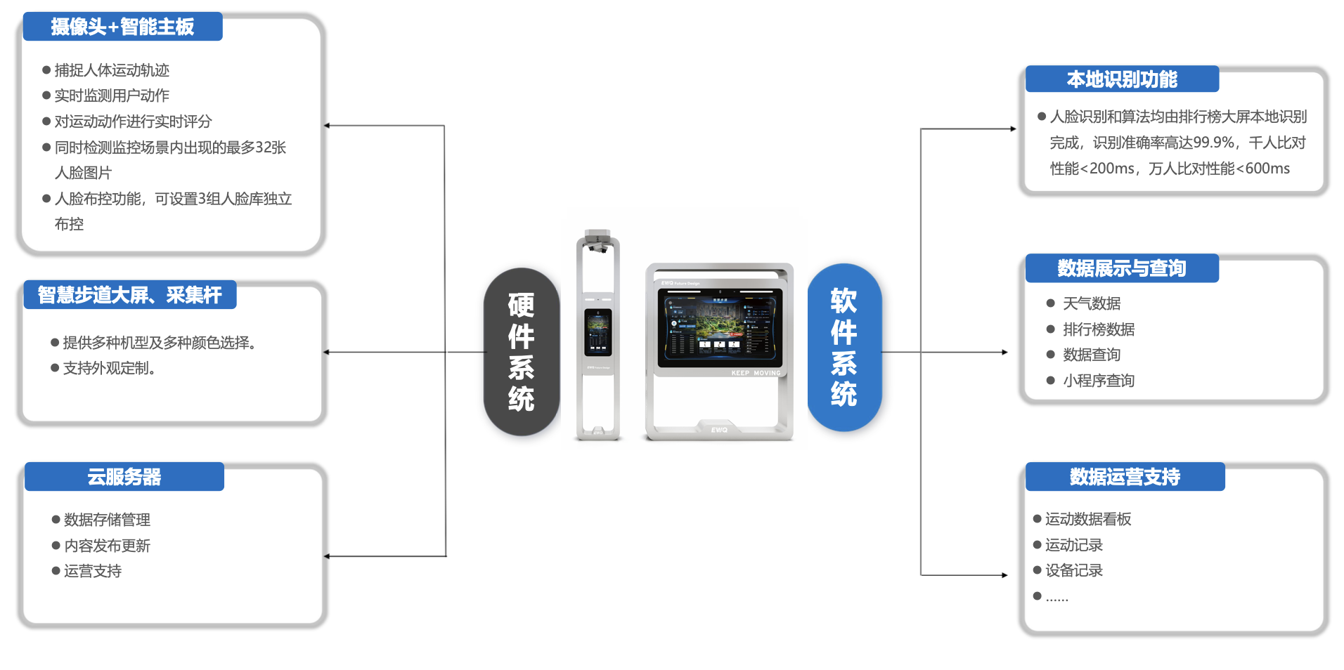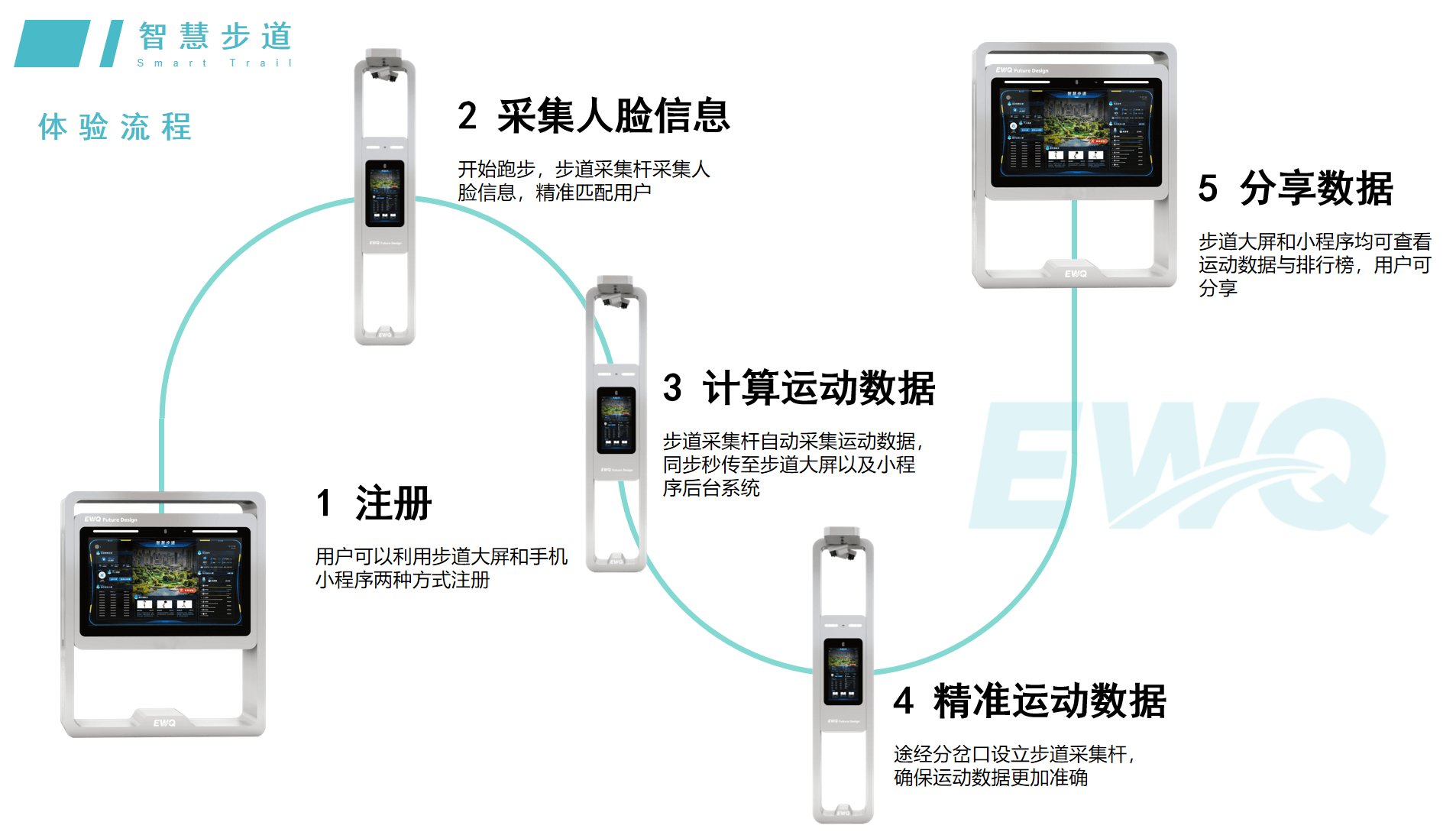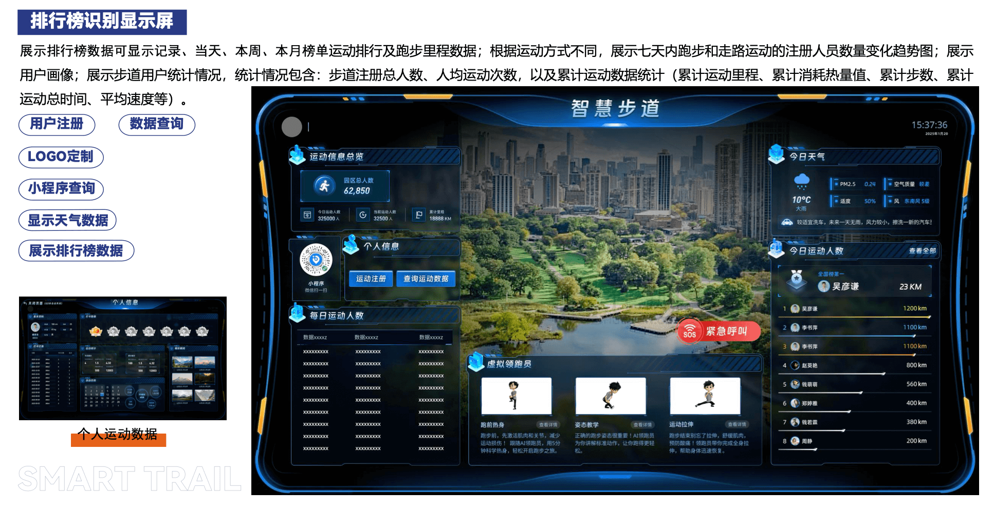 智慧步道系统通过采用智慧化的科技手段,将跑步前、跑步中、跑步后三个阶段串联起来,包括人脸注册、人脸识别测速、运动数据分析、陪跑光影、健康指导、社交分享、运动数据管控等,为跑步者提供一个更智慧、更健康的智慧化运动环境。