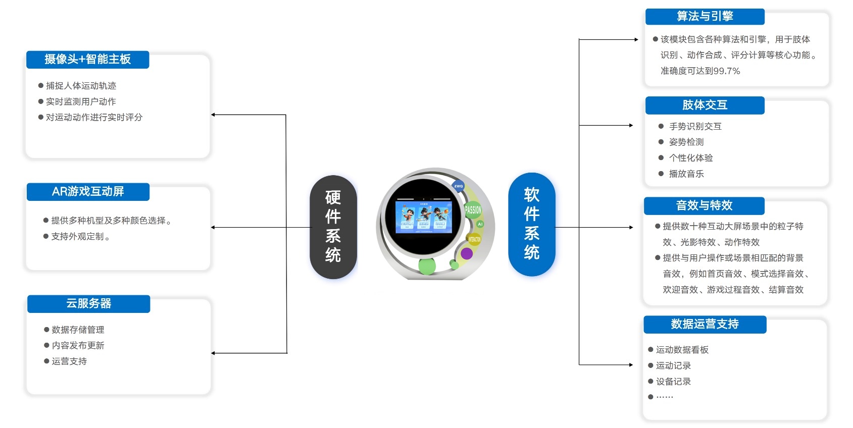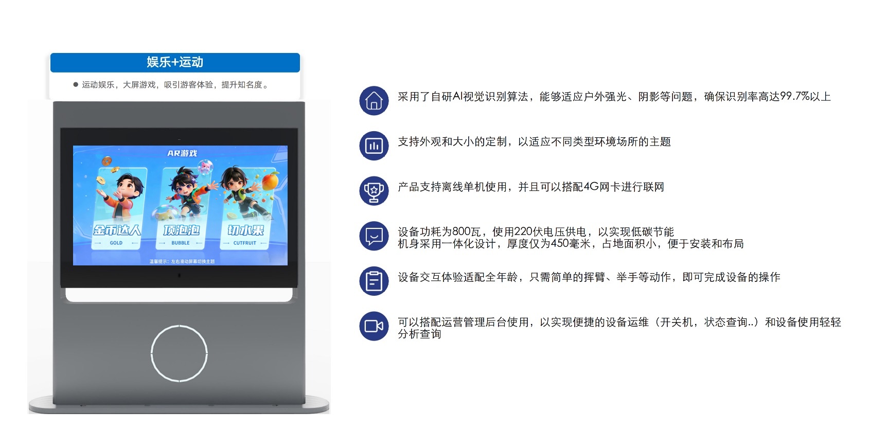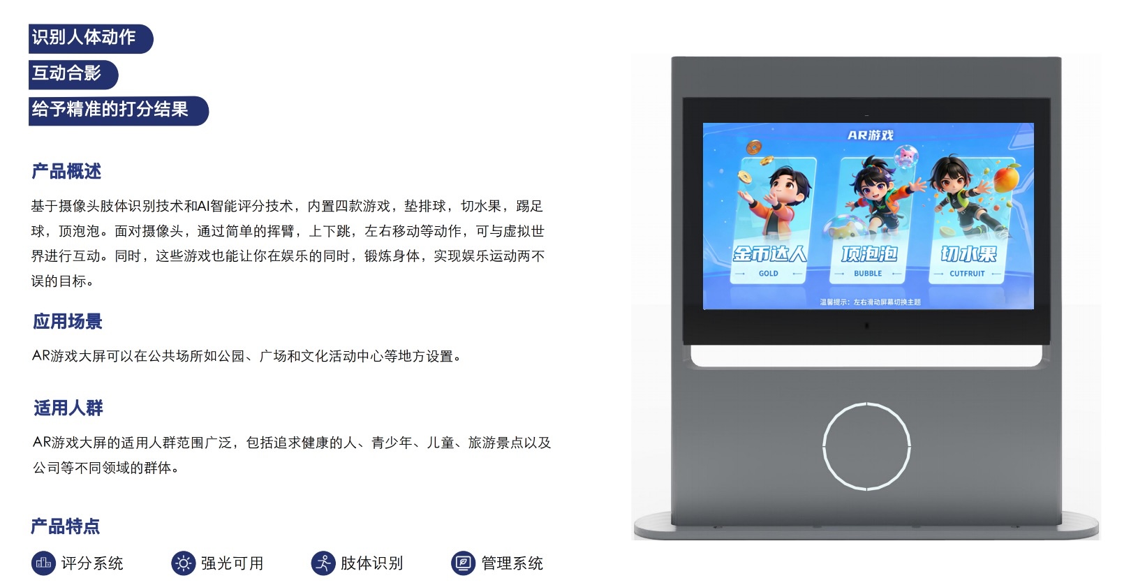 AR互动大屏基于摄像头肢体识别技术和AI智能评分技术,将游戏互动与现代科技相结合。包含踢足球、垫排球、切水果等多款互动游戏,锻炼提升用户协调能力。
