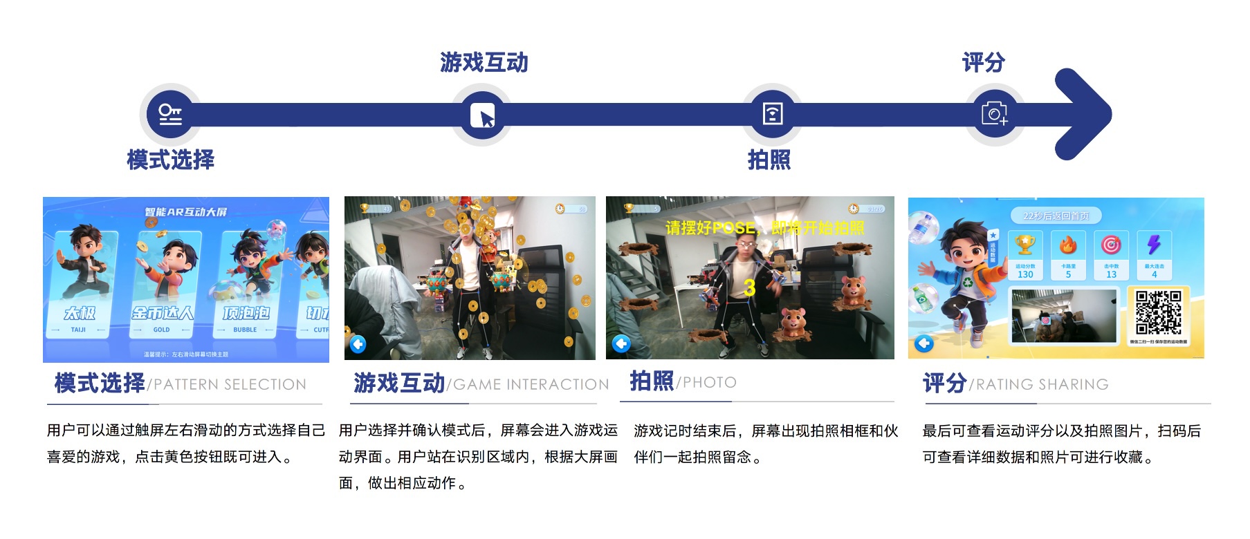AR武术基于摄像头肢体识别技术和AI智能评分技术,包含将互动与现代科技相结合。 通过与大屏幕上的武术大师指导和互动,帮助用户正确理解和学习太极拳的动作和技巧。