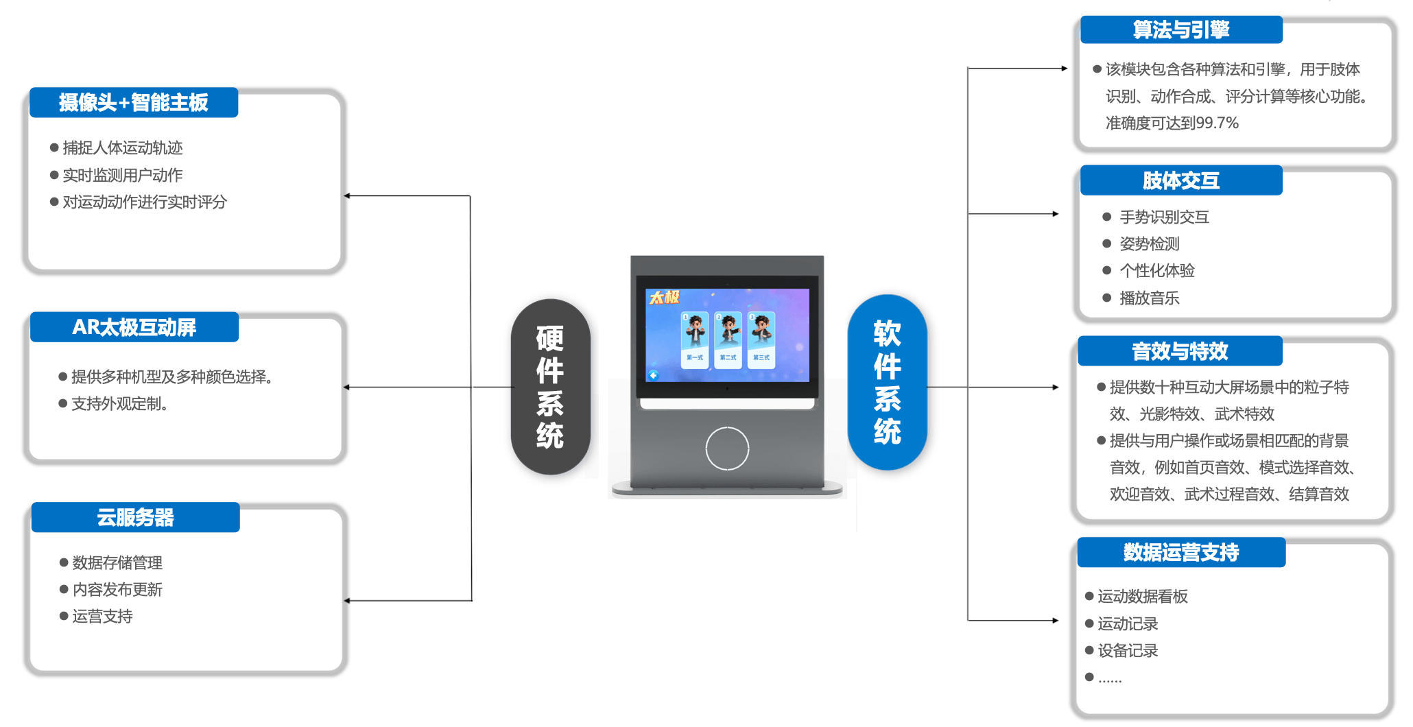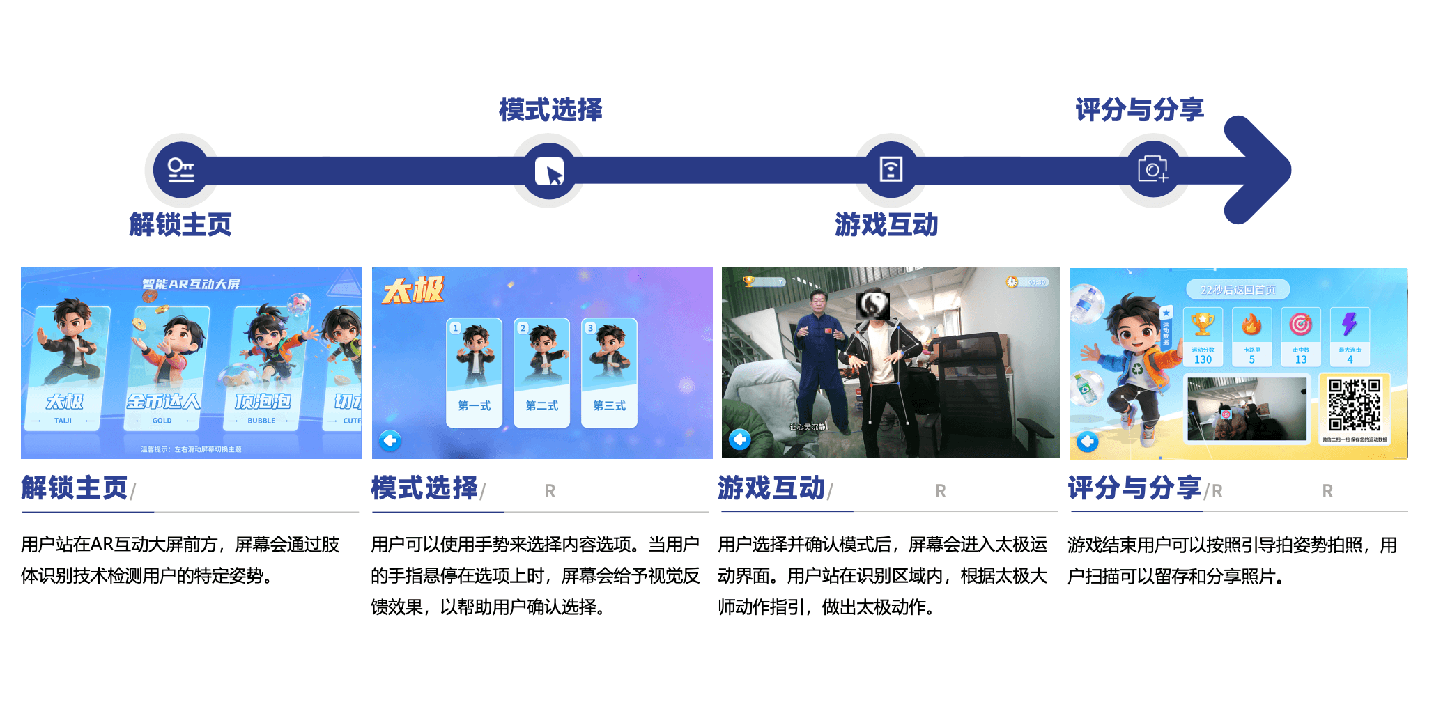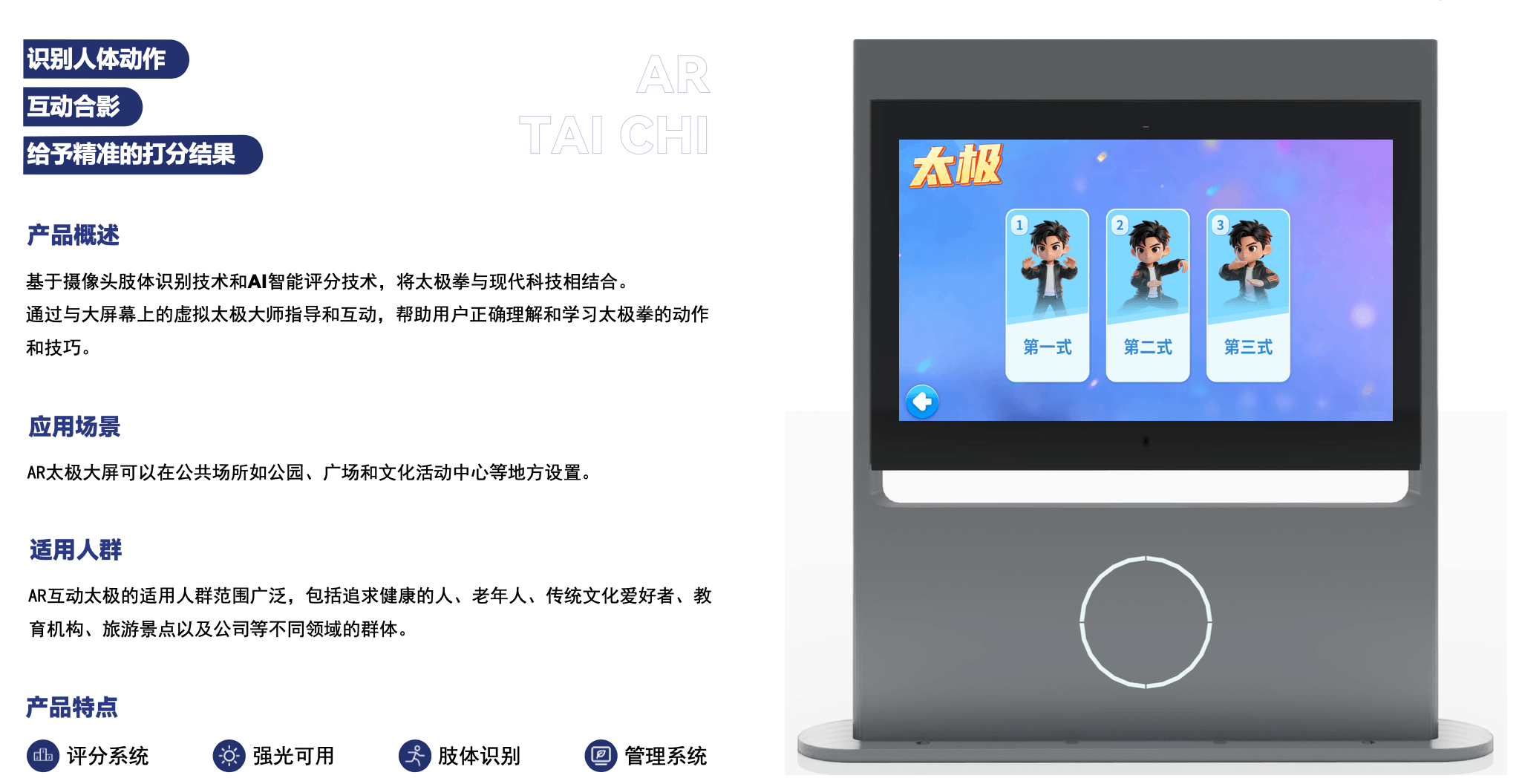 AR武术基于摄像头肢体识别技术和AI智能评分技术,包含将互动与现代科技相结合。 通过与大屏幕上的武术大师指导和互动,帮助用户正确理解和学习太极拳的动作和技巧。