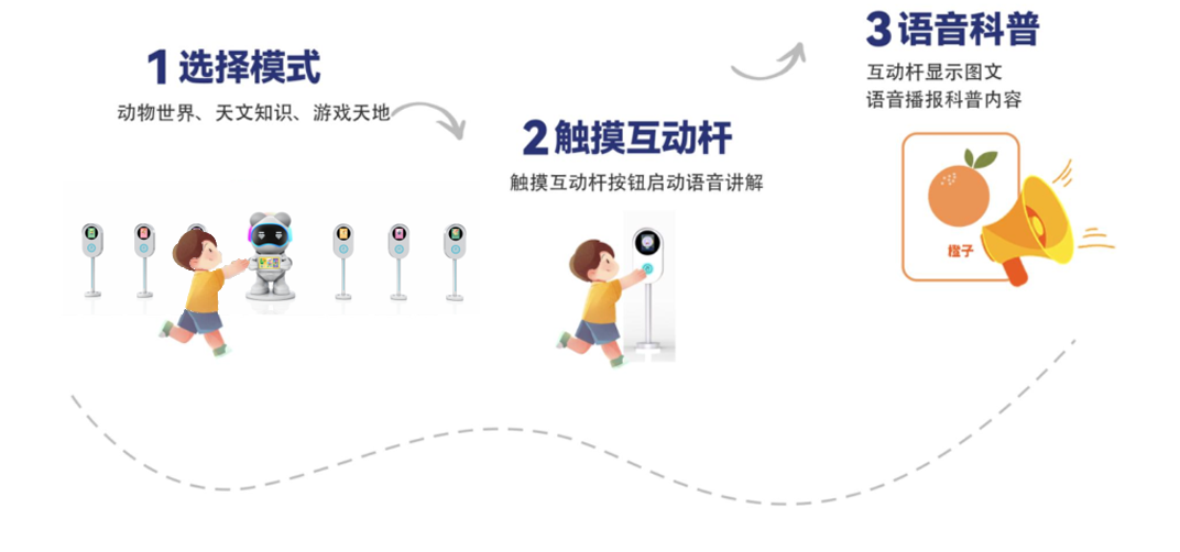 儿童科普设备助力在亲子活动空间中,家长引导孩子的学习乐趣,以虚拟人物形象完成对适龄儿童对世界的科普认知,更有趣的了解关于世界上的小知识,增加儿童对事物的好奇性,产品支持语音引导功能对于适龄儿童交互性跟便捷。